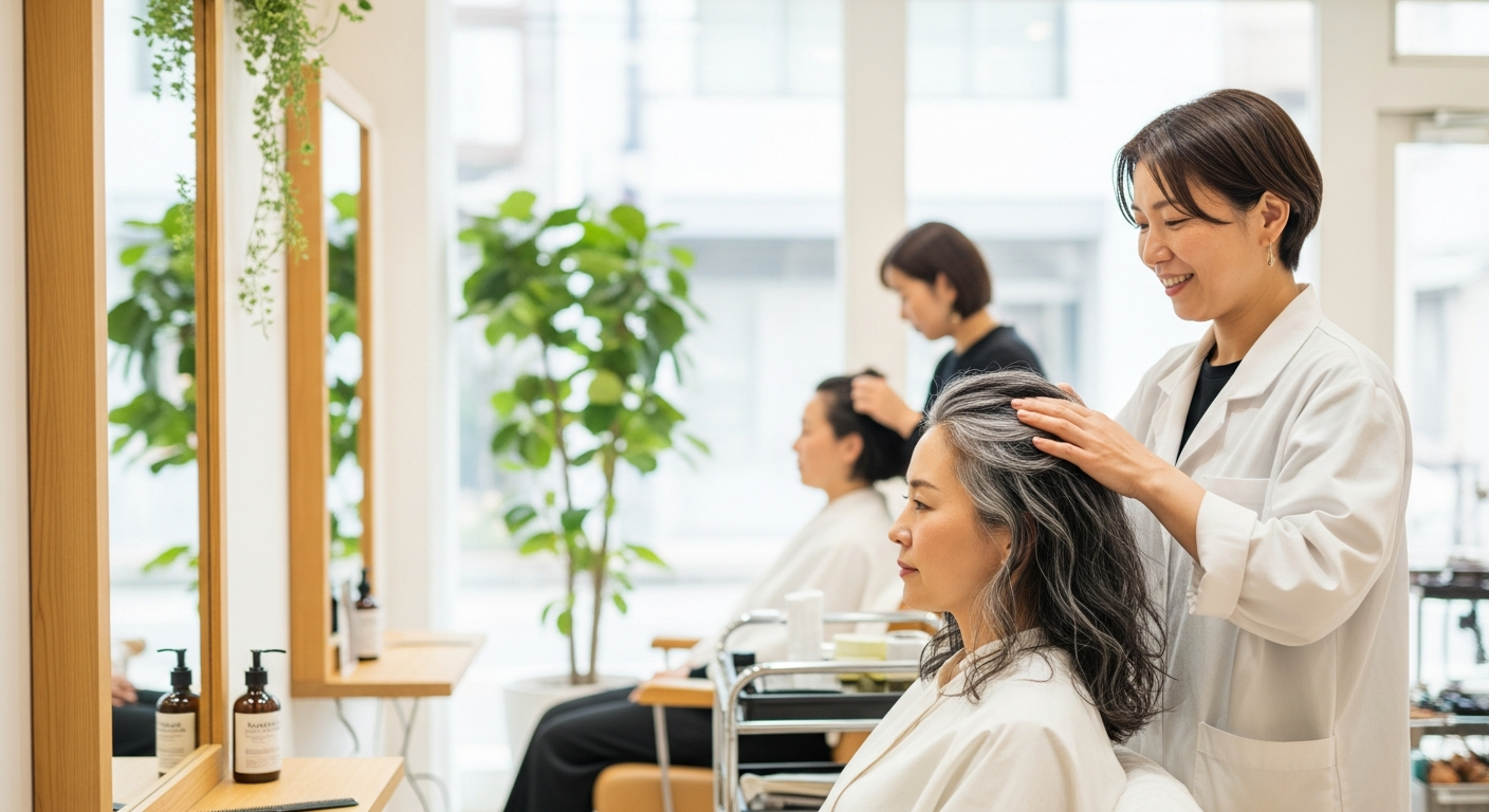 白髪染めをする際、薬剤を頭皮に直接擦り込まず、根元ギリギリから塗布する「ゼロテク(根元を浮かせる技術)」を美容師にお願いしてみましょう。頭皮への付着を最小限に抑えることで、ダメージを大幅に軽減できます。